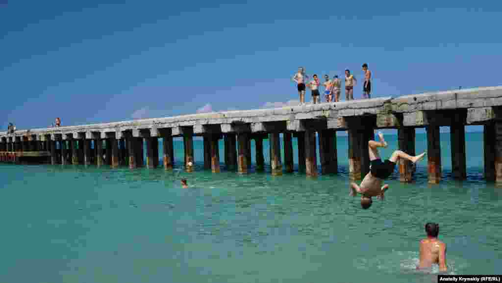 По сути, Новофедоровка превращается в главный пляж райцентра Саки и всего района. Со своей «изюминкой» – грохотом турбин во время плановых полетов российских тяжелых истребителей и штурмовиков, аэродром которых никуда не делся. Пляжную жизнь поселка запечатлел корреспондент Крым.Реалии.